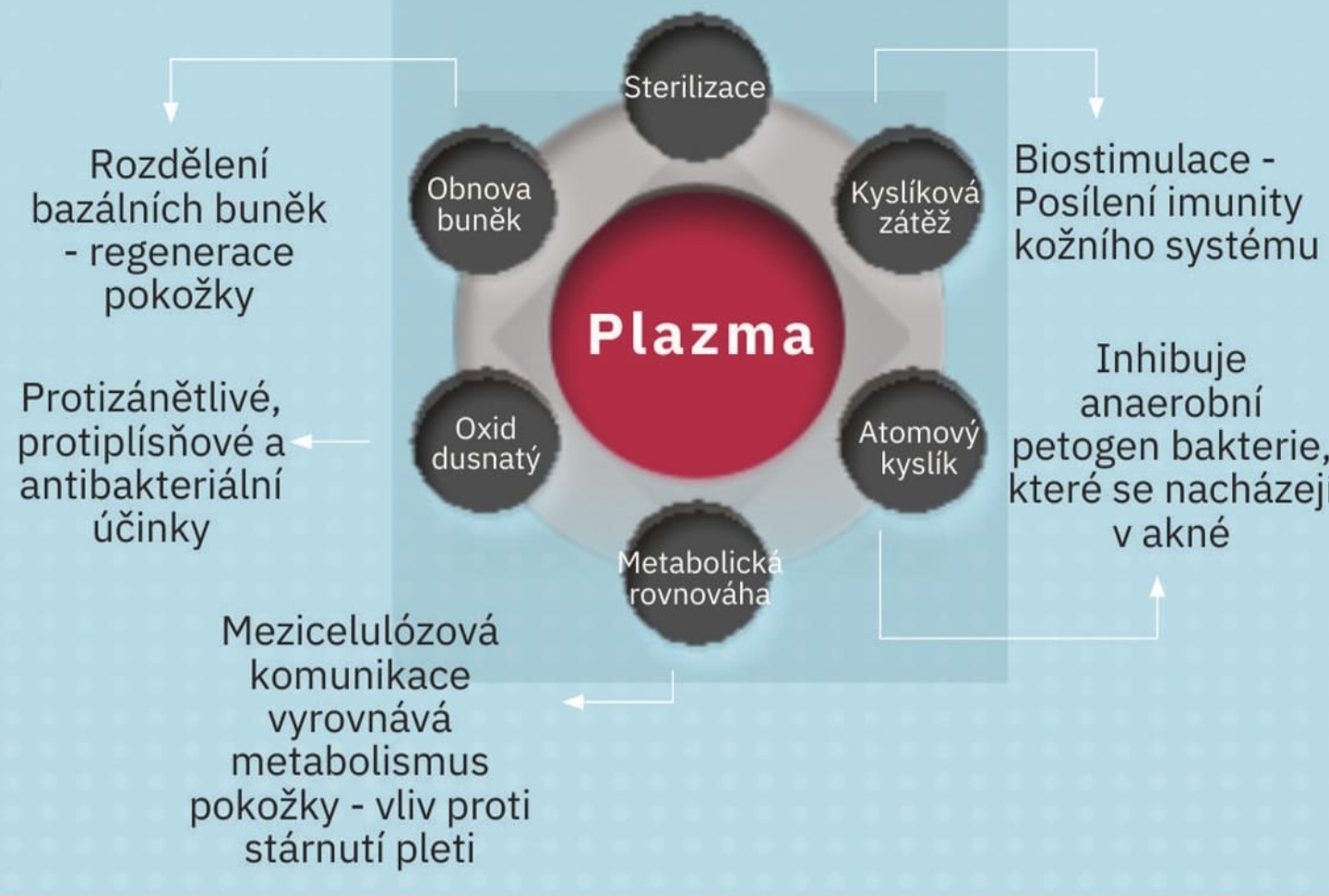 Spouští dělení bazálních buněk.Zvyšuje produkci bílkovin a nového kolagenu. Stimuluje tvorbu nových cév, čímž napomáhá hojení ran. Posiluje imunitní systém kůže a epidermalní bariéru. Zlepšuje buněčnou komunikaci bělení pokožky. Atomární kyslík v atmosférické plazmě okysličuje melanin v krvi, a proto je účinný při bělení pokožky. Skvrny, ať už hormonální pigmentace, pigmentace související s věkem, skvrny od slunce atd. Bělení kůže plazmou je účinné zejména u skvrn na kůži pod kterými probíhá zánětlivý proces. Tím, že plazma snižuje zánět, snižuje také hladinu hemoglobinu v okolí kožní skvrny a tím se skvrna zmenší.